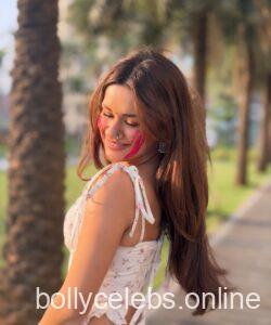 In the second image, the camera captures a closer, more intimate moment. Avneet tilts her head slightly downward with a shy, heartwarming smile, allowing her long hair to cascade over one shoulder. The pink Holi color brushed across her cheeks stands out vividly against her glowing skin. The sunlight highlights her features, giving the frame a warm, golden-hour charm that feels both candid and cinematic.